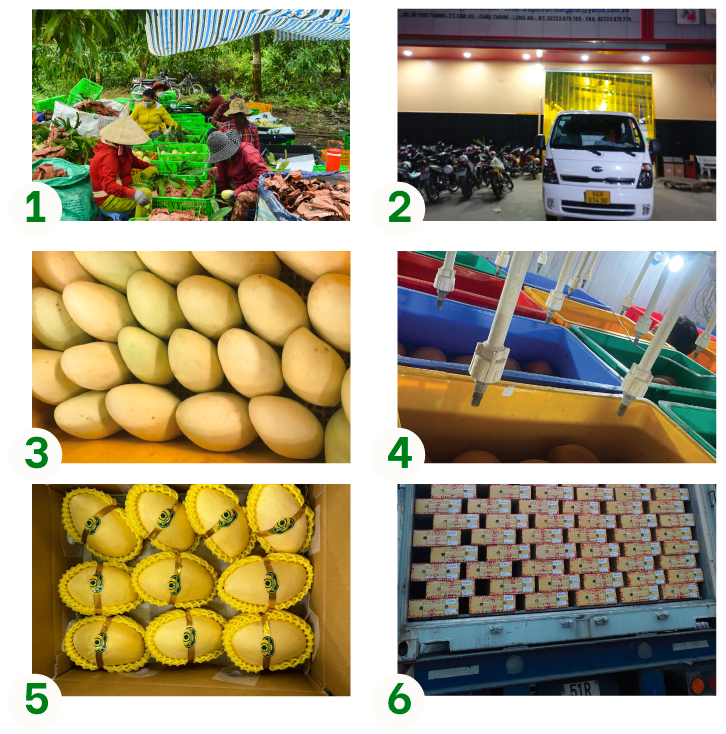 - Sau khi phân loại và trải qua quá trình xử lý VHT, xoài sẽ được làm mát trong kho mát, sau đó sẽ tiến hành quá trình ủ chín.