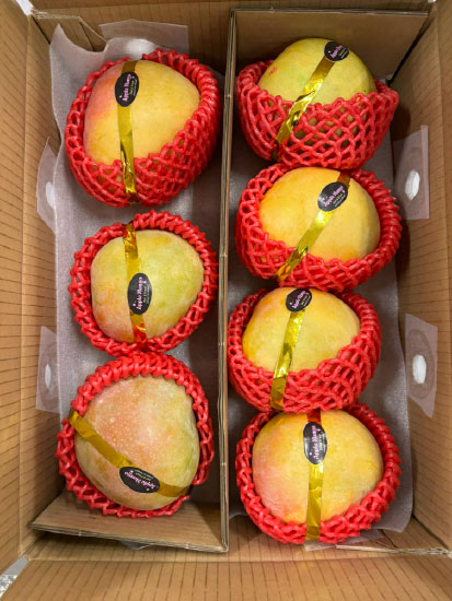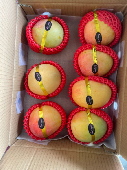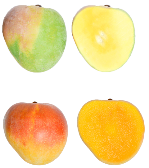 Khi chín: Da chuyển sang màu vàng nhạt, ửng đỏ nhiều hơn. Thơm hương đặc trưng, thịt xoài màu cam, ngọt thanh, dẻo, mọng nước mà rất ít xơ.
