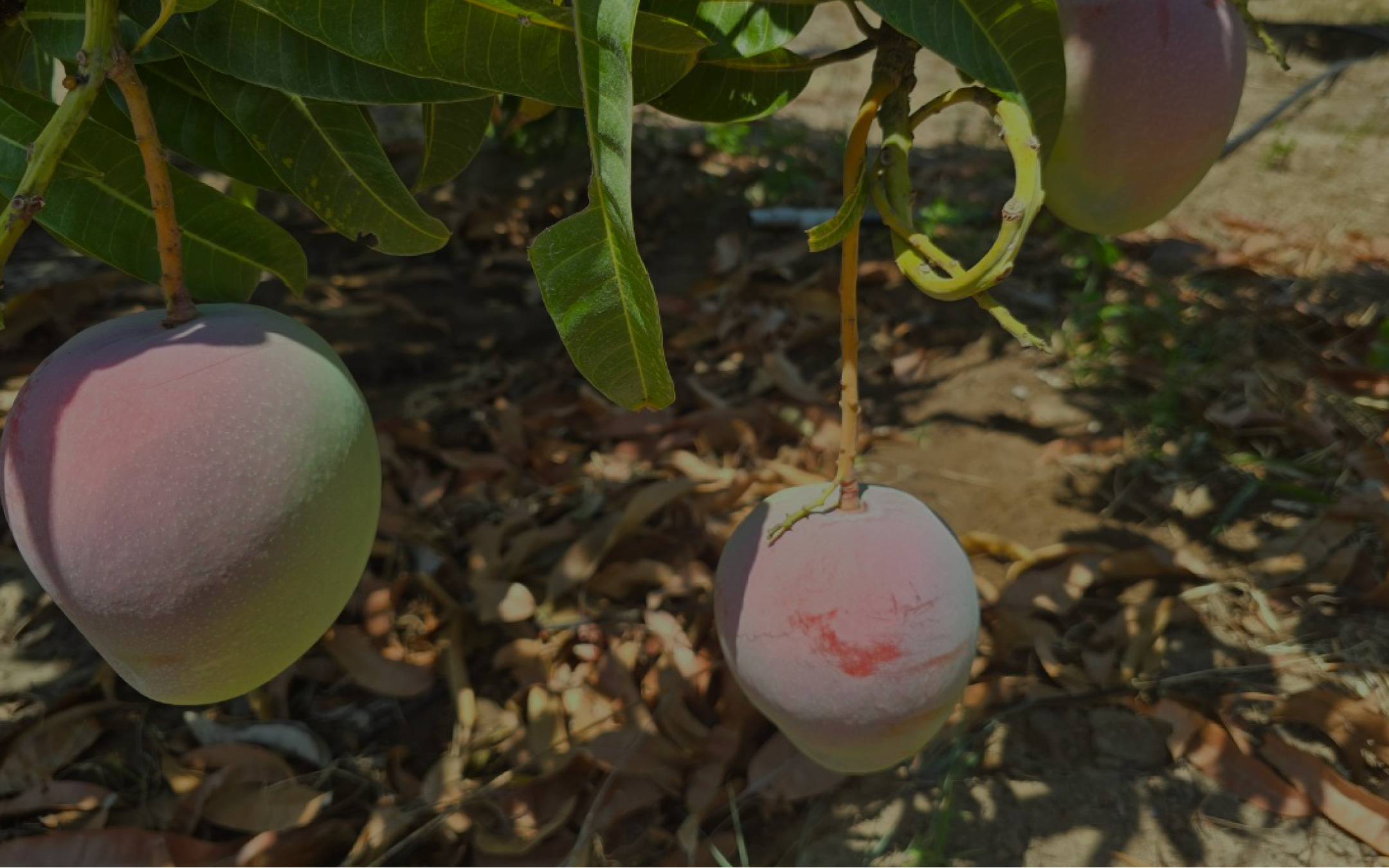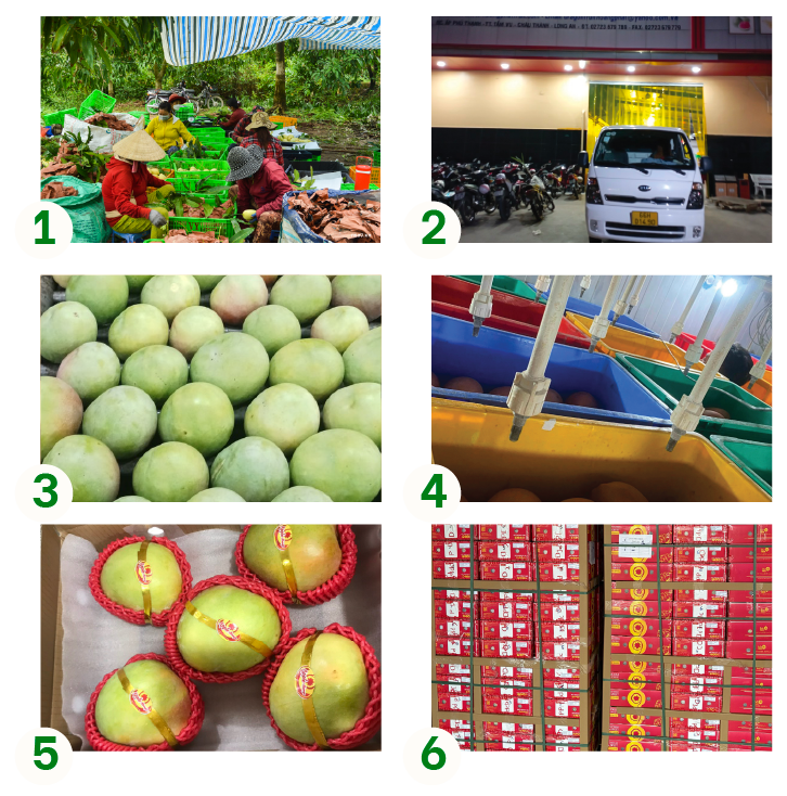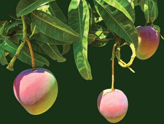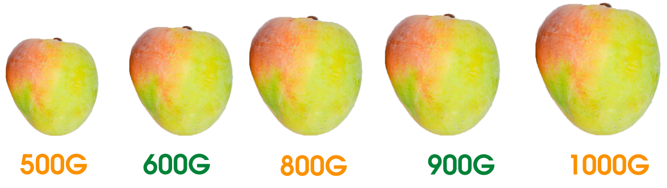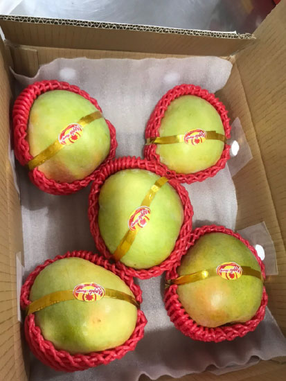 Khi sống: Trái to tròn cân đối, da xanh hơi ửng hồng/tím. Bóp cứng, không có mùi thơm. Thịt xoài màu vàng nhạt, ăn ít chua, thơm và giòn rôm rốp.